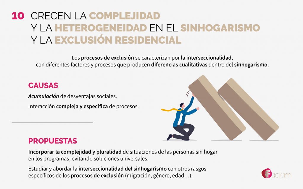 Se trata de incidir en la interseccionalidad que caracteriza los procesos de exclusión social y constatar que los diferentes “perfiles” que podemos identificar dentro del sinhogarismo no se derivan únicamente del grado de acumulación de desventajas sociales, sino también de la interacción compleja y específica de procesos que da lugar a diferencias cualitativas en las características del sinhogarismo.