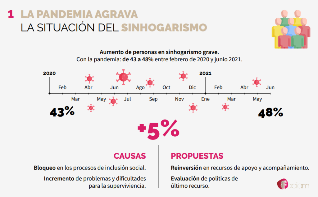 Desde que empezó la pandemia en febrero de 2020 hasta junio de 2021, aproximadamente un año y medio, el sinhogarismo más grave (categorías ETHOS 1 y 2 de la clasificación europea de personas sin hogar y exclusión residencial) ha aumentado desde el 43% al 48%. A medida que se ha ido incrementado esta situación han ido disminuyendo simultáneamente las cifras de exclusión residencial (ETHOS 3 y 4) que han pasado del 57% al 52%.
